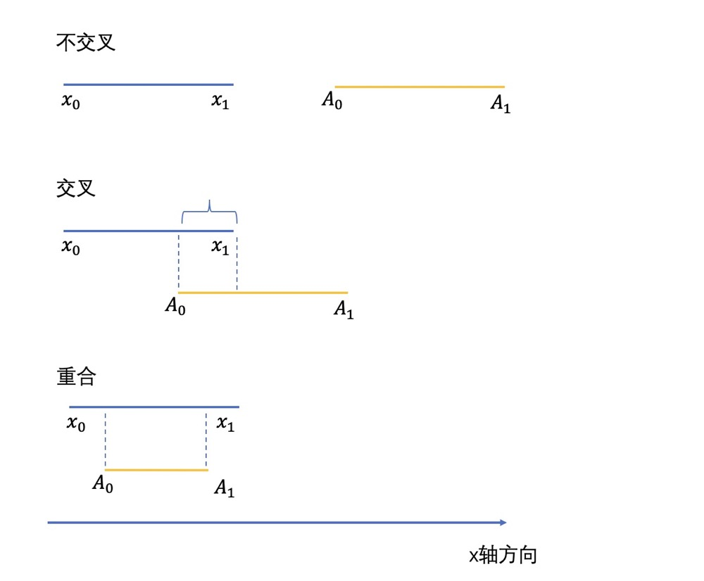 纵轴方向是一样的,我们来判断两个框重合与否。其中 \(x_{0}\) 为 \(rec1\) 左上角的 \(x\) 坐标,\(x_{1}\) 是 \(rec1\) 右下角的 \(x\) 坐标。\(A_{0}\) 为 \(rec2\) 的左上角 \(x\) 坐标,\(A_{1}\) 是 \(rec2\) 的右下角 \(x\) 坐标。