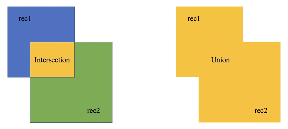假设,我们有两个框,\(rec1\)与\(rec2\),我们要计算其\(IOU\)。其中\(IOU\)的计算公式为,其交叉面积\(Intersection\)除以其并集\(Union\)。