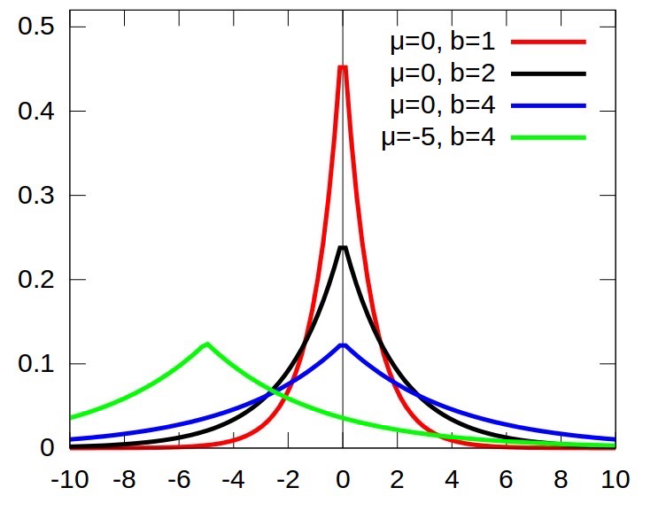 假设,我们的数据数据是稀疏的,不妨就认为它来自某种\(laplace\)分布。其中\(laplace\)的概率密度函数图像如下图所示: