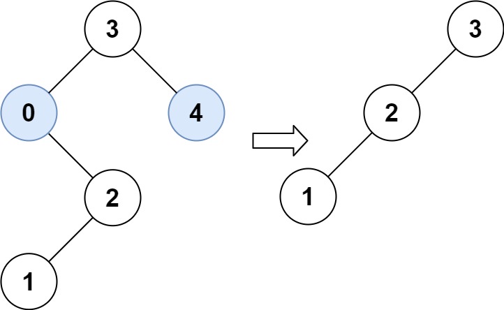 > > 输入:root = [3,0,4,null,2,null,null,1], low = 1, high =